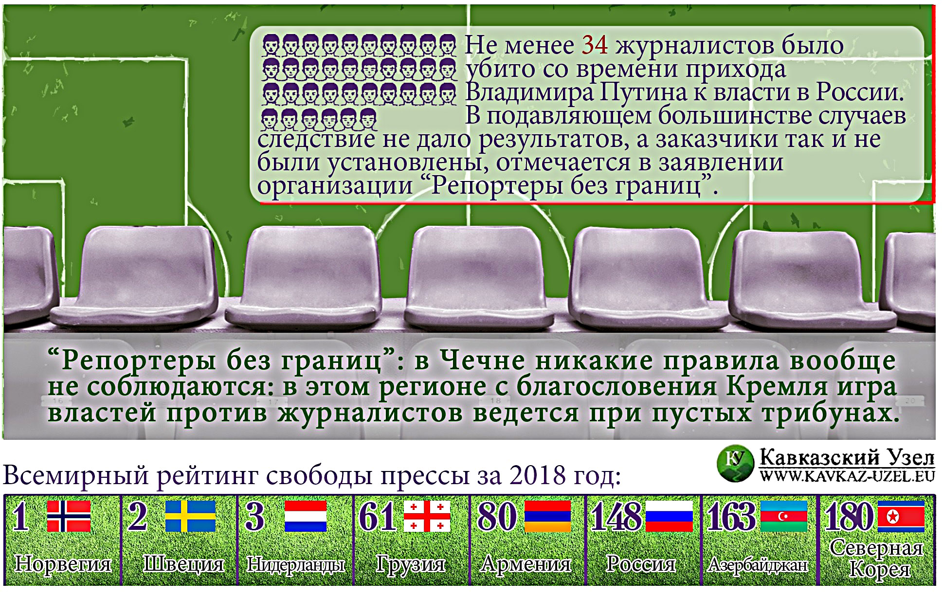 "Репортеры без границ" по итогам 2016 года поместили Россию в своем "Индексе уровня свободы прессы в мире" на 148-е из 180 мест, причем Чечня была названа "черной дырой для новостей". В организации отмечали, что в стране свободы для выражения мнений стало меньше, чем в любое другое время со времен распада Советского Союза. Россия занимает 148-е место из 180 во всемирном рэнкинге свободы прессы за 2018 год, опубликованном РБГ в 2018 году.